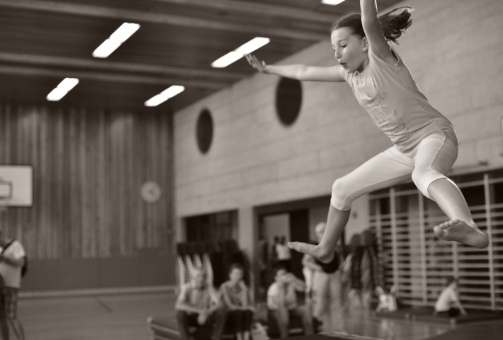 - Soit de petits jeux, soit l’apprentissage de différents pas de base tels que marcher, sautiller, galoper, faire des pas chassés etc. en musique le plus souvent